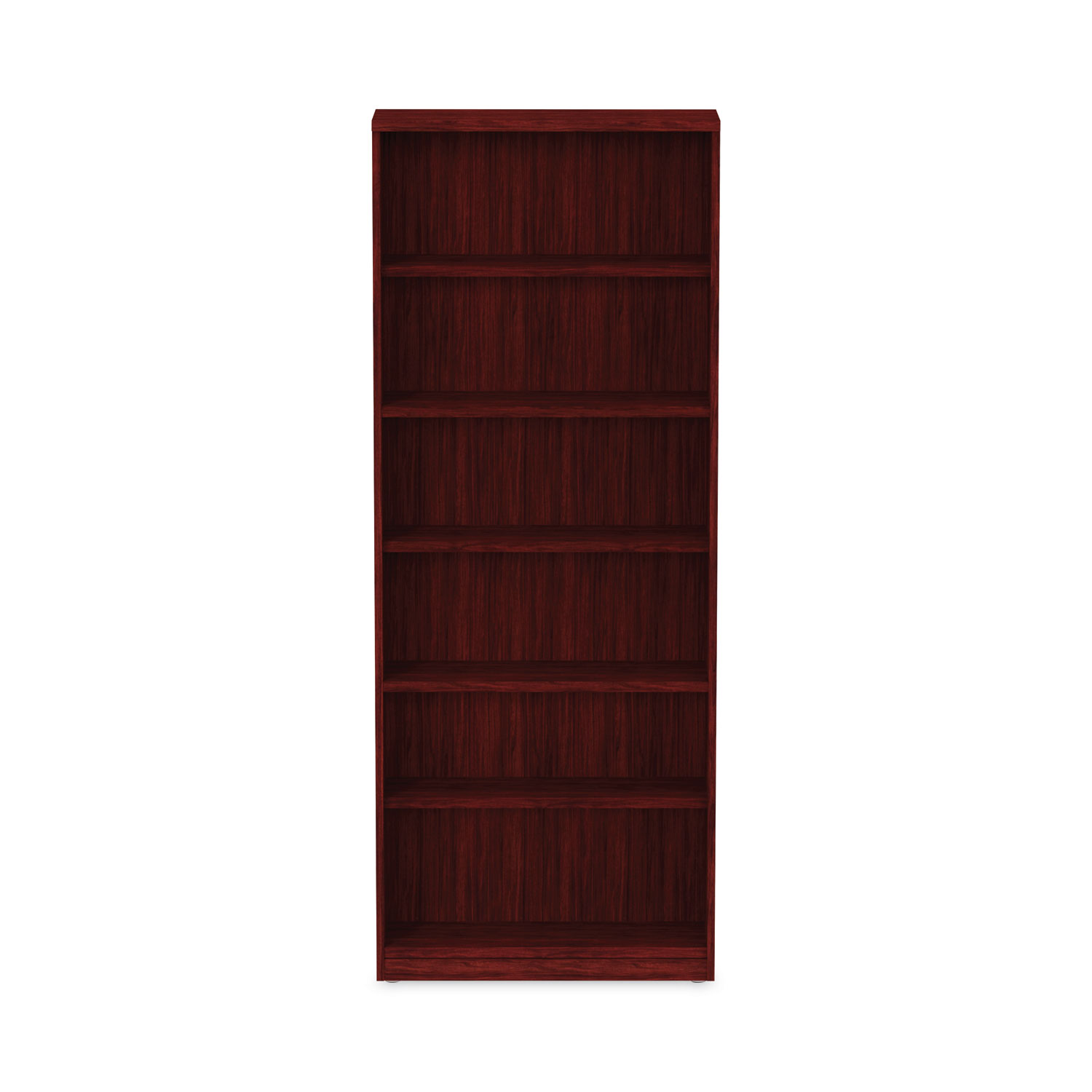 Alera Valencia Series 31 3/4″ x 14″ x 80 3/8″ Cherry 6-Shelf Bookcase. Contemporary design; woodgrain laminate construction. Commercial-grade side panels with protective edges. Top and bottom shelf are fixed, middle shelf is adjustable.