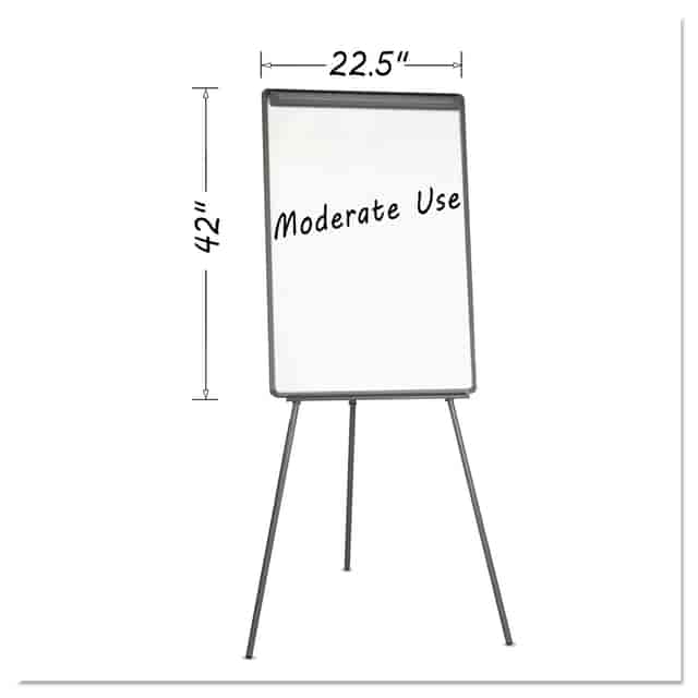 Master Vision Basic Tripod Melamine Presentation Easel, 22.5″ x 42″, White Surface, Black Plastic/Steel Frame. Equipped with a generous full length marker tray, it holds any size of easel pad with its no pinch pad retainer. It is constructed with a lightweight adjustable tubular frame that folds flat for easy storage.