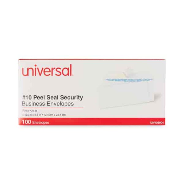 Universal Peel Seal Strip Security Tint Business Envelope, #10, Square Flap, Self-Adhesive Closure, 4.13 x 9.5, White, 100/Box